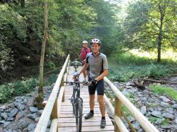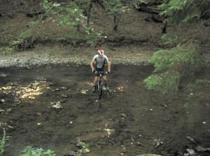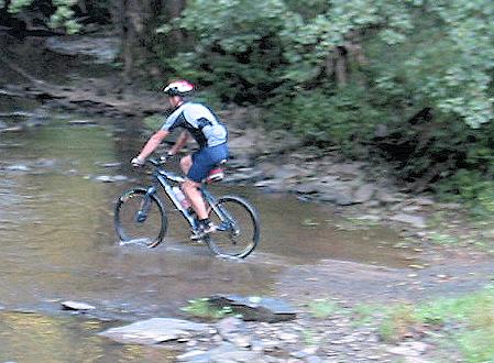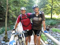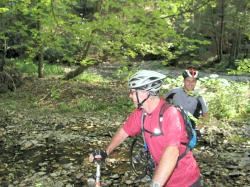 Tourbericht der Lieser-Lieser Tour vom 21.09.2003: "Erst Hoch über dem Liesertal, und plötzlich mitten drin" ![]() Am Sonntag um 10.oo Uhr trafen wir uns beim Stolda zur ersten gemeinsamen Ausfahrt nach dem Vulkanbike 2003. Leider waren bei dem herrlichen Spätsommerbikewetter nur Otti, Ich (Jörg als Tourguide) und Manni mit von der Partie. Die Tour hatte ich mir grob in Gedanken zusammengestellt, so das wir gegen 12.30 Uhr wieder beim Stolda eintreffen würden, doch es sollte alles anders werden als ich es geplant hatte. Noch über den Vulkanbike 2003 und die Eindrücke die er hinterlassen hatte plaudernd, fuhren wir durchs Wiesental über die Kurley nach Schutz, auf diesem schönen Bergabstück merkte man das der Herbst doch schon die Eifel erreicht hat, denn die Luft zog noch klapperkalt vom Speicherbach her zu uns herüber. In Schutz fuhren wir in Höhe des Sägewerks rechts den Berg hinauf die schöne Panoramastrecke nach Bleckhausen. Von Bleckhausen aus fuhren wir hinab durch das Trombachtal ins Liesertal und dann in Richtung Manderscheid, an der Kobeslochhütte machten wir eine kurze Rast. Otti bemerkte beim Blick ins Tal, es würde wie in Kanada aussehen und Manni klärte uns darüber auf das das Kobesloch eigentlich unterhalb von Bettenfeld liegen würde. Über Hahnerfläch, wo wir das erste Foto schossen, fuhren wir zur neuen Lieserbrücke. Ich hatte mein Bike schon geschultert und befand mich mitten auf der Brücke, dichtgefolgt von Otti. Ich rief Manni zu einige Meter unterhalb gäbe es eine Furt, denn er wollte die Scheibenbremsen seines neuen Cannondale noch wässern. Otti hörte dieses sah die Furt und drehte sofort um, um auch durch die Lieser zu fahren. Hier durch / überquerten wir die Lieser zum ersten mal. ![]() Nun strampelten wir vorbei an der Häselhütte hoch nach Eckfeld, um über den Maare-Mosel-Radweg nach Pantenburg zu fahren. Am Rastplatz Eckfeld trafen wir auf 5 Fun-Biker aus Daun die auch auf Ihrer sonntäglichen Runde waren. Nach einem kurzen Plausch und dem schiessen des Fotos (Danke Michael) setzten wir unsere Fahrt fort. Von Pantenburg aus ging es hinter dem Dorf (Grafschaftsweg) über die Höhe in Richtung Liesertal zurück. Obwohl ich diese Strecke schon einige Male gefahren bin, übersah ich an diesem herlichen Sonntag durch diverse Plaudereien eine Kreuzung und wir fuhren in Richtung Altenberghütte. An der nächsten Kreuzung erkannte ich meinen Fehler, und wollte wieder zurück, doch da der Weg ganz gut aussah und die grobe Richtung stimmte entschloss ich mich diesen Weg hinab ins Liesertal zu nehmen. Ohne zu Murren folgten Manni und Otti mir den doch sehr steilen und steinigen Weg hinab, eine Kreuzung mit dem Hinweis zur Altenberghütte passierten wir geradeaus, so das die Altenberghütte nun links von uns lag. In den letzten Kehren der Abfahrt ahnte ich schon böses, denn auf einer Wanderkarte hatte ich schon einen Weg in diesem Bereich gesehen der aber an der Lieser endete. Wir kamen schließlich auf eine Wiese und der Weg endete. Immer noch guter Dinge fuhren wir einem Pfad folgend Lieseraufwärts, denn ich wusste die Brücke in der Nähe des Burgweihers die ich eigentlich ansteuern wollte, konnte nicht weit entfernt sein. Kurze Zeit später versperrte eine Steilwand unseren Pfad. Es war uns klar das wir nicht mehr zurück fahren wollten, und so machten wir uns auf die Lieser mit dem Bike auf dem Rücken zu durchwaten. Über diverse Steine hüpfend kamen wir fasst trockenen Fusses auf der anderen Seite an. ![]() ![]() ![]()